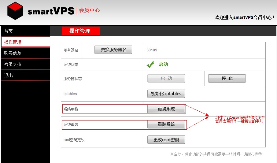 先说smartvps后台优点:简单、干净、易操作,再说缺点:操作系统之间的切换需要5分钟或者更长时间,重装系统也是一样。习惯了solusvm的你习惯么?一键搞定的事儿分了两次!